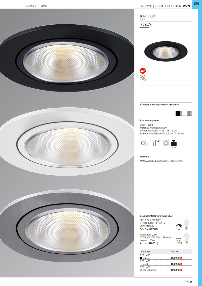 Die runde KAHOLO Einbauleuchte ist mit einer E27 Fassung ausgestattet. Der Einbauring ist starr und wurde für den Einsatz einer Allgebrauchslampe für den Fassungstyp E27 konzipiert. Die Einbauleuchte ist fertig für den direkten Anschluss an 230V Netzspannung. Diese Leuchte ist geeignet für Leuchtmittel der Energieklassen: E - A++