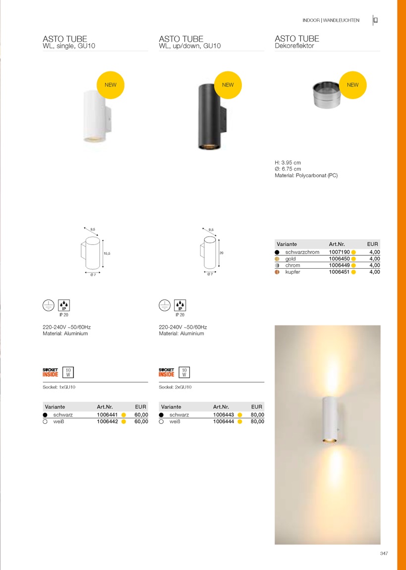 Schlank und elegant strahlt ASTO TUBE auch von der Wand. Dabei verströmt die formschöne Wandaufbauleuchte mit ihrem GU10 Hochvolt Halogen oder LED-Leuchtmittel ein blendarmes Licht, das sich flexibel ausrichten lässt. Das aus Aluminium gefertigte Gehäuse ist wahlweise in Schwarz oder Weiß, die Reflektoren Gold, Chrom oder Kupfer erhältlich. Dazu ist ASTO TUBE schnell und direkt an eine Netzspannung von 230V installiert.